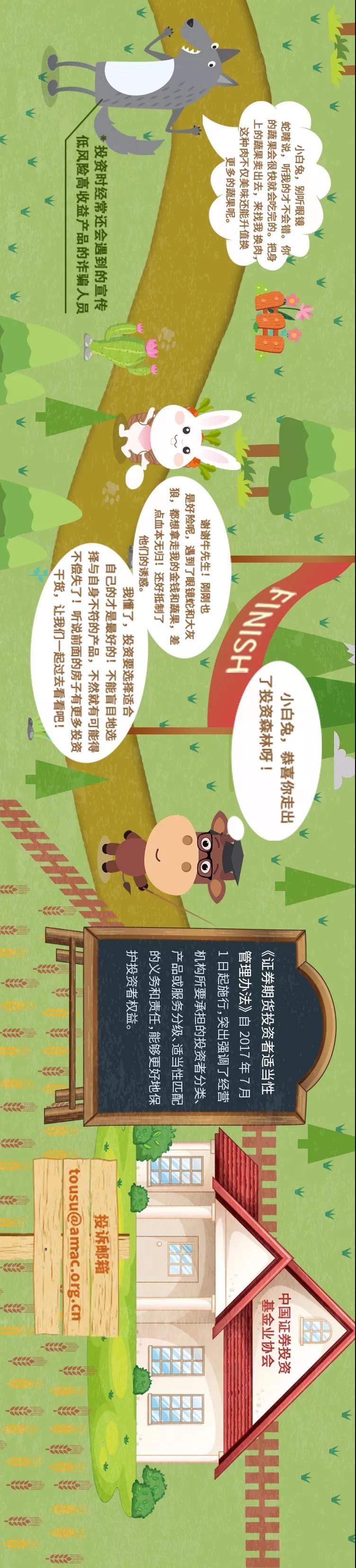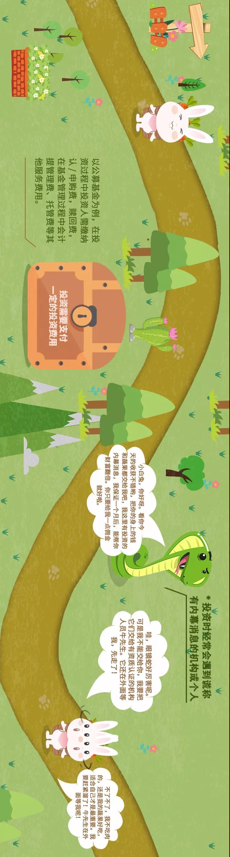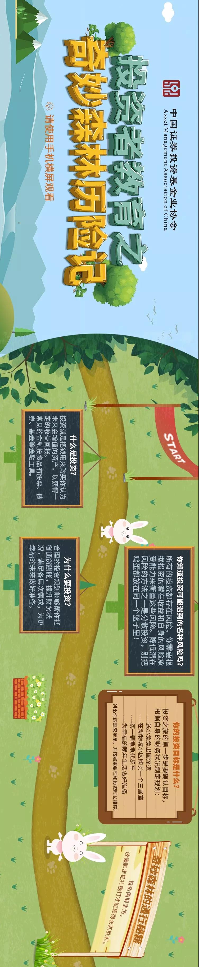 中国证券投资基金业协会特别策划、推出以“奇妙森林历险记”为主题制作的投资者教育路线图,将主人公小白兔经过投资森林一路遇到的投资知识点、常见骗局等事件串联起来,以简单有趣的画面教您投资基础知识,不再做小白。